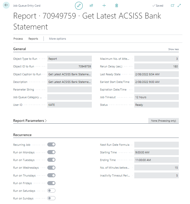 Microsoft Business Central has the function to schedule jobs and this includes the ability to schedule the collection of bank transactions from the ACSISS service. The ACSISS connect app adds a report object to the business central environment during installation with the following details