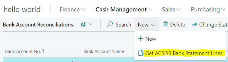 Go to Bank Account Reconciliations / New / Get ACSISS Bank Statement Lines
