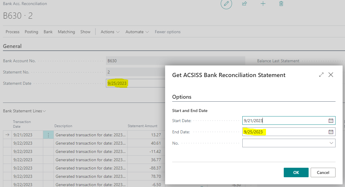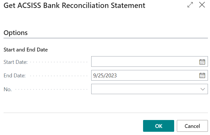 The Get ACSISS Bank Reconciliation Statement screen will be displayed / Enter the Start Date and End Date for the desired transaction date range / Enter the Bank Account No. or click the drop-down button and select the Bank Account No. / click OK
