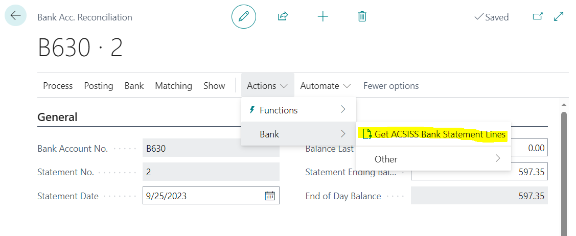 To append transactions to the existing Bank Account Reconciliation, go to Actions / Bank / Get ACSISS Bank Statement Lines