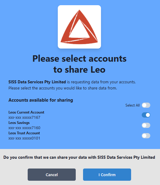 A list of available accounts will be displayed > select the desired account/s > click I Confirm. You are now sharing these bank accounts with ACSISS.