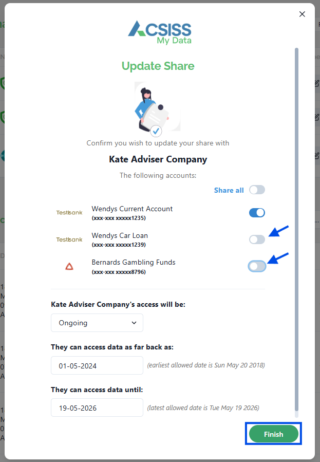 Data is still being shared with ACSISS. To cancel this share, follow these steps - Disconnect your bank account from ACSISS